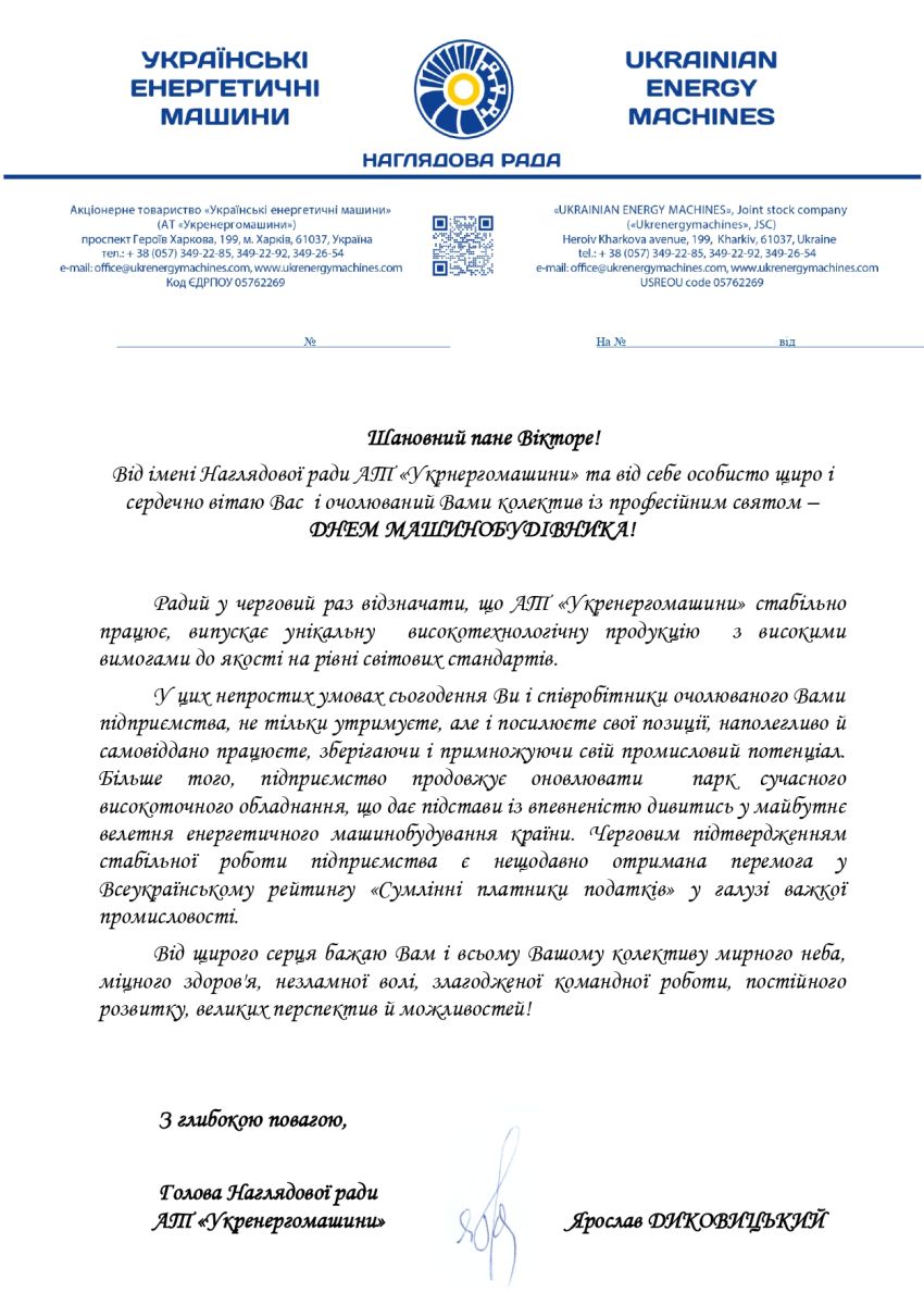 Наглядова рада Акціонерного товариства "Українські енергетичні машини" надіслала на адресу підприємства привітального листа з нагоди професійного свята Дня машинобудівника України